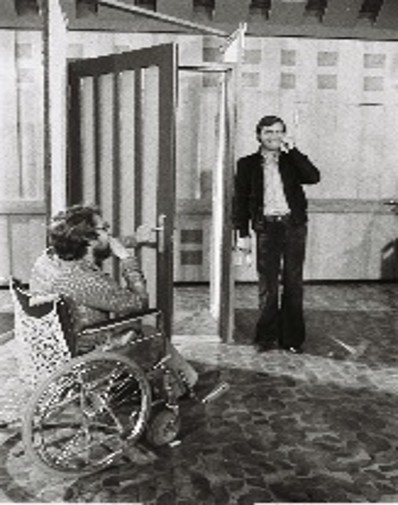 Dreharbeiten einer Gaststättenszene für den cbf Film im Stadtmuseum, Quelle: Diasammlung cbf. Zwei Männer, einer davon im Rollstuhl, sitzen in einer Gaststätte. Im Hintergrund steht eine Frau. Ein Aufnahmemikrophon ragt vorne ins Bild.